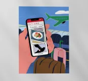 Un'illustrazione che mostra una mano che tiene in mano uno smartphone, scegliendo tra le destinazioni di volo online. L'immagine cattura l'eccitazione moderna e la possibilità di pianificare un viaggio in un mondo digitale.