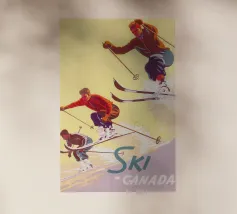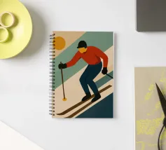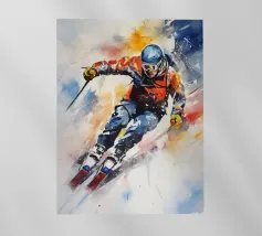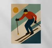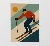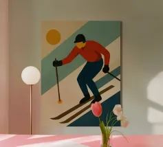 La rappresentazione minimalista di uno sciatore in colori vivaci cattura il movimento e l'emozione dello sci. Le forme geometriche aggiungono una dinamica unica all'immagine.