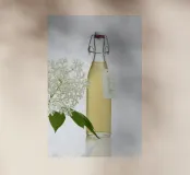 Una bottiglia di sciroppo di fiori di sambuco fatto in casa in una bottiglia con tappo oscillante e un fiore di sambuco