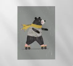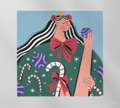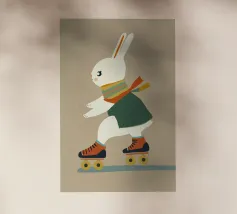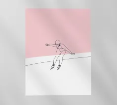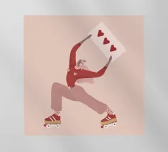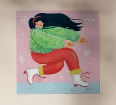 Una figura vestita con un maglione verde e pantaloni rossi pattina sul ghiaccio su uno sfondo rosa con fiocchi di neve. La figura sembra godersi la stagione invernale.