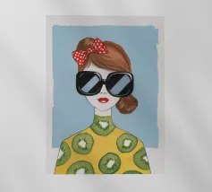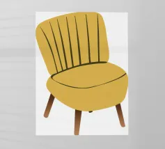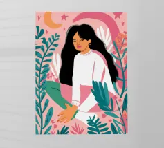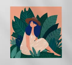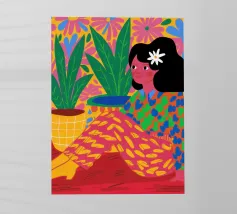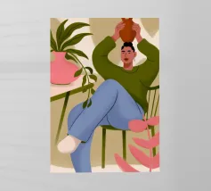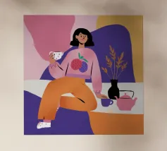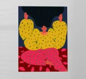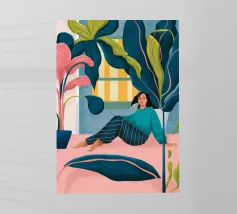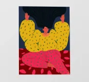 Illustrazione di una donna con top giallo a pois e pantaloni rosa, sdraiata sul pavimento. La sua posa rilassata e soddisfatta crea una scena di comodo, elegante e tranquillo svago.