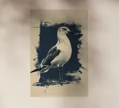 Illustrazione audace e minimalista in stile linoleografico di un gabbiano che si erge con tranquilla sicurezza. La sua forma strutturata in bianco e nero è coronata da una piccola corona dorata, simbolo di resilienza e libertà. Lo sfondo pulito e neutro esalta la sua presenza regale ma ribelle, rendendolo un pezzo di grande effetto e moderno.