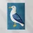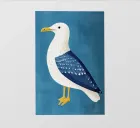 The picture shows a minimalist seagull illustration with a clear, graphic style. The seagull has a white body, blue wings with white accents and a yellow beak and legs. The background is blue, which creates a nice contrast to the white seagull. The style is simple, modern and decorative, with a reduced colour palette and clean lines - almost like a stylised logo or modern wall art. A beautiful example of graphic design art!