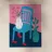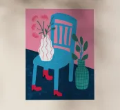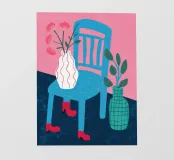 Un'affascinante ed eccentrica natura morta con una pianta in vaso appoggiata su una sedia blu brillante. La composizione è semplice ma piena di carattere, con colori vivaci e uno stile giocoso.