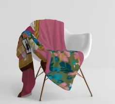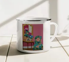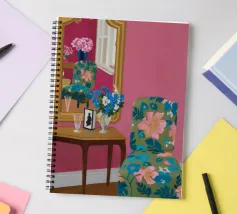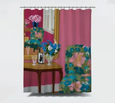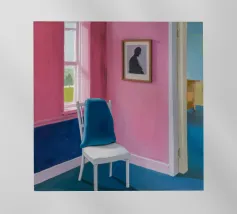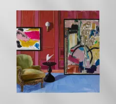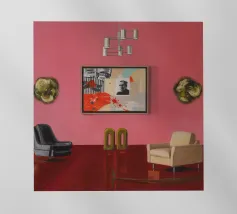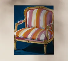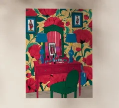 Una scena d'interni con una poltrona vuota rivestita con un motivo chintz floreale, riflessa in un grande specchio. La stanza è dipinta nei toni del rosa e del rosso, creando un'atmosfera calda, accogliente e leggermente nostalgica.
