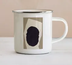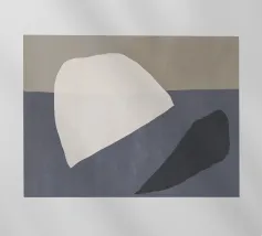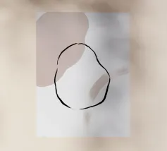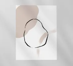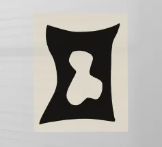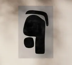 Una grande forma nera irregolare è posizionata al centro su uno sfondo più chiaro a contrasto, dall'aspetto ruvido e strappato. Il design è minimalista, con un'atmosfera astratta e una tavolozza di colori semplice.