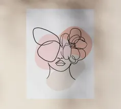 Un disegno al tratto minimalista raffigura un volto sereno intrecciato con un grande fiore arancione e foglie verdi. L'uso di linee semplici e di tonalità della terra crea una composizione elegante e rilassante.