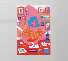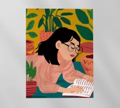 Un'illustrazione di una donna che legge intensamente un libro alla sua scrivania, circondata da piante d'appartamento e illuminata da una lampada, che trasmette un senso di tranquilla concentrazione.