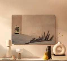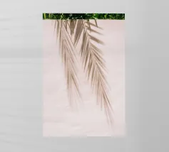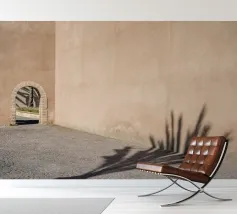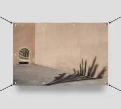 L'ombra di una palma a Essouira. Antico muro di cinta della vecchia Medina di Essaouira. Fotografia di strada in Marocco.