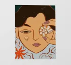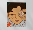A woman holds a seashell to one eye, her gaze half-hidden, as if peering into the secret currents of the ocean. The piece is a love letter to intuition, mystery, and the ancient language of the sea, capturing the delicate dialogue between soul and water.