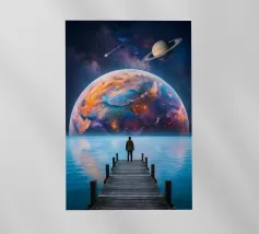 Una scena surreale di un pescatore solitario che si lancia nella galassia. Questo collage tranquillo e contemplativo cattura la pace della solitudine e la vastità del pensiero. Perfetto per sognatori e minimalisti.