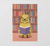 Simpatica pera felice che legge un libro con gli occhiali in biblioteca pellicola backlit