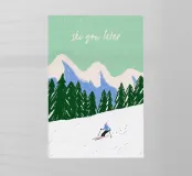 "Ski you later": un gioco di parole che unisce sport invernali e umorismo. L'illustrazione mostra uno sciatore su una pista bianca, incorniciata da abeti verde intenso e montagne color pastello. Un'immagine che cattura la leggerezza dello sci e allo stesso tempo evoca un sorriso. Perfetta per chi ama l'inverno, le montagne e il buon umore. Moderna, giocosa e un vero e proprio eye-catcher per la stagione invernale.