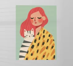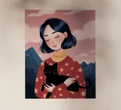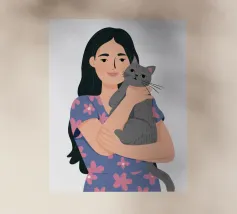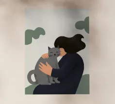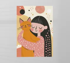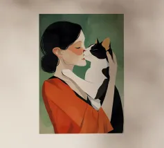 Una persona che indossa un vivace top arancione tiene vicino un elegante gatto nero, i loro sguardi sono allineati, evidenziando il forte legame tra l'uomo e l'animale domestico su uno sfondo semplice e dai toni caldi.