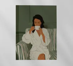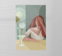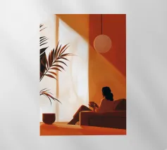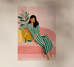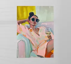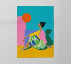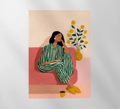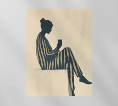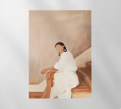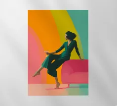 Mescolando toni di metà secolo e grazia moderna, questo pezzo esplora l'intersezione tra forma e solitudine. La palette di colori tenui e la geometria audace riecheggiano la presenza tranquilla della donna, creando una composizione che sembra un jazz visivo, sofisticato e senza sforzo.