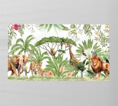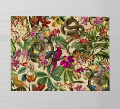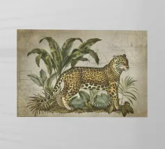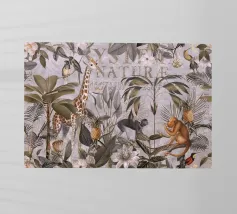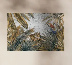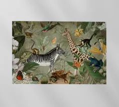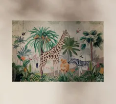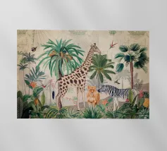 Questo incantevole disegno unisce l'eleganza vittoriana alla fantasia tropicale in una scena meravigliosamente stravagante. Graziose signore in ornati abiti d'epoca si aggirano in paesaggi lussureggianti pieni di palme e fiori esotici, interagendo giocosamente con mansueti animali selvatici. Alcune cavalcano zebre con composta dignità, altre si rilassano su divani barocchi accanto a sereni ghepardi, mentre alcune offrono dolcetti a gentili giraffe. La composizione è ricca di dettagli e deliziosamente surreale, creando un mondo vivace e pieno di affascinanti sorprese che si rivelano più a lungo si guarda.