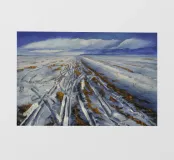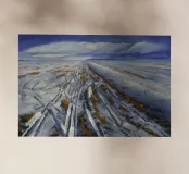 Una composizione astratta di tubi, un molo o un ponte è rappresentata con linee diagonali forti e ripetute; la tavolozza monocromatica e sbiancata dal sole crea un paesaggio industriale potente, ritmico e moderno.