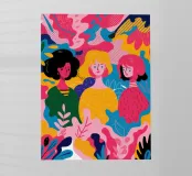 Un'illustrazione bella e potente raffigura un gruppo eterogeneo di donne, i cui volti e capelli si intrecciano con una vibrante esplosione di fiori colorati, celebrando la sorellanza, la diversitร  e la crescita.