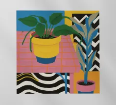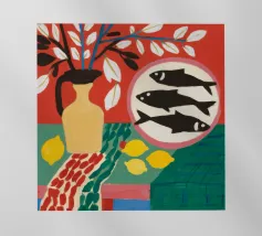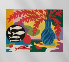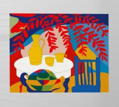 Una natura morta astratta e altamente stilizzata che presenta una bevanda in un bicchiere di vimini con una cannuccia blu. La scena è ambientata su una superficie con audaci motivi rossi e gialli, su uno sfondo verde strutturato.