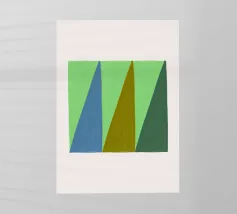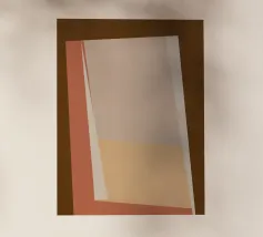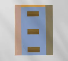 Diverse forme geometriche dai colori tenui sono sovrapposte a uno sfondo chiaro. Un rettangolo color oliva opaco domina una parte della tela, sovrapponendosi parzialmente a una forma giallo pallido, con un accenno di blu che fa capolino da sotto.