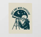Uno scheletro in felpa che osserva le stelle? Questo disegno retro-vintage gioca con l'umorismo dark e la passione celeste. Perfetto per gli appassionati di astronomia, i fotografi notturni, gli amanti dell'arte spaziale o i fan delle immagini alternative. Con il suo stile grafico deciso e l'accenno al bisogno ossessivo di "solo un altro scatto", questo visual cattura lo spirito dei sognatori insaziabili. Ideale per chi ha la testa tra le stelle... fino alle ossa.
