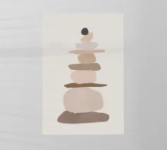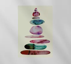 Una serie di forme ovali impilate, di dimensioni e tonalità diverse, formano una torre. I colori passano dolcemente da toni scuri in basso a toni più chiari in alto, culminando in un piccolo cerchio scuro.
