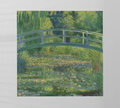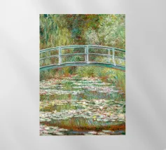 Dipinto colorato di una finestra aperta su uno stagno di ninfee con ponte.