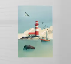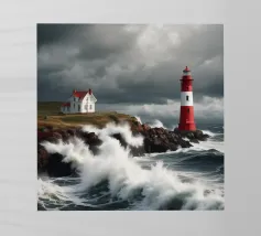 Un faro a strisce bianche e rosse si erge resistente tra onde tumultuose sotto un cielo drammatico. La scena emana un senso di forza e perseveranza contro i potenti elementi della natura.