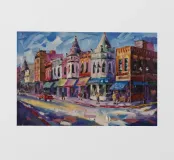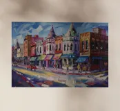 Una strada cittadina con edifici storici a più piani è immersa nella luce calda e brillante di un sole basso, che proietta lunghe ombre e crea una scena urbana vibrante ed energica con un tocco di nostalgia.