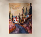 Una strada tortuosa fiancheggiata da alti cipressi è immersa nella calda luce dorata del crepuscolo; lo stile espressivo e pittorico crea un viaggio sognante e romantico attraverso la campagna.