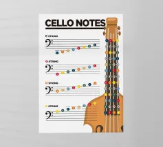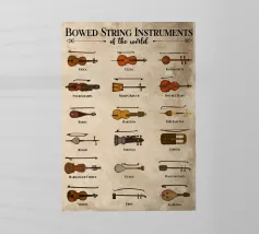 Esplora la bellezza degli strumenti a corda con questa dettagliata tabella didattica che presenta violino, violoncello, viola, chitarra, arpa e ukulele.