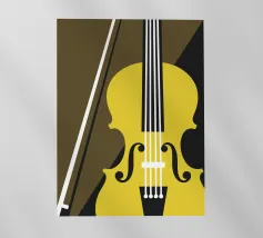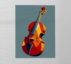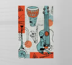 Un moderno dipinto astratto con forme geometriche che formano chitarre, violini e note musicali in una composizione audace e colorata. Lo sfondo strutturato e la disposizione dinamica evocano un senso di ritmo e di espressione artistica.