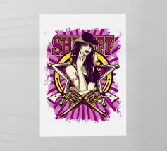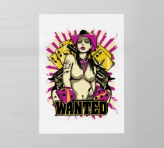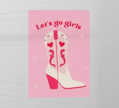 Una donna stilizzata che indossa un cappello da cowboy e occhiali da sole a forma di cuore è collocata su uno sfondo con cactus e cuori. La frase "Stuck On You" è ben visibile.