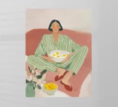Un momento di riflessione in una stanza vestita di rosa tenue e verde giungla. Siede nell'immobilità, avvolta nella seta a righe e nel silenzio domenicale, circondata dal conforto di fiori audaci e luci soffuse.