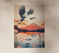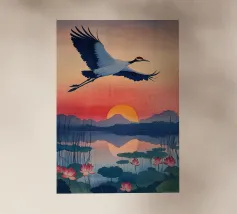A woodcut with lotus leaves and water lilies on the shore, with a setting sun in a pale pink sky over a calm lake. An island can be seen on the horizon in the background, surrounded by trees and distant mountains. This artwork embodies the aesthetics of the Edo period and shows the simplicity of the woodcut techniques and the calm colours.