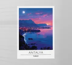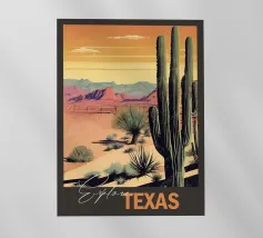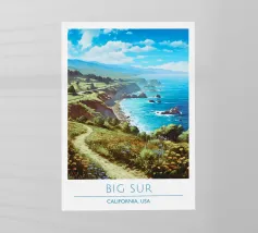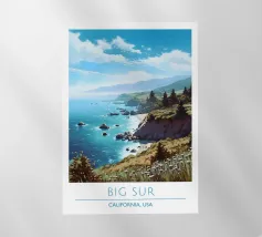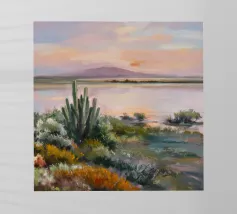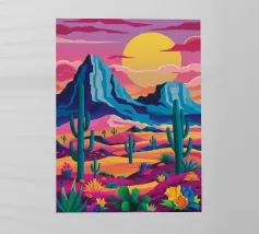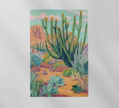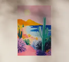 Un'illustrazione paesaggistica vivida e suggestiva di un deserto pieno di cactus che si affaccia su una drammatica vista costiera al tramonto. Le scogliere dorate e le piante di agave dai toni violacei contrastano splendidamente con l'oceano turchese e il cielo luminoso. Quest'opera d'arte cattura la bellezza selvaggia dei paesaggi aridi che incontrano il mare, perfetta per gli amanti della Baja California, dell'Arizona o delle vibrazioni del deserto mediterraneo. Una stampa murale di grande effetto per interni boho, per gli amanti della natura o per l'arredamento di una casa al mare.
