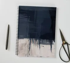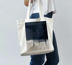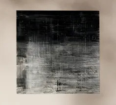 Tecnica mista (pittura acrilica ed elaborazione digitale aggiunta) espressiva, astratta e strutturata in un lunatico grigio ardesia scuro, blu indaco scuro e neutri sabbiosi. Un'opera grintosa e d'impatto per interni moderni.