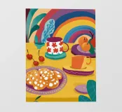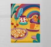 Una magica scena di tea party รจ immersa nella luce di un vibrante arcobaleno, con tรจ e biscotti disposti su un tavolo, creando un momento di pura gioia, meraviglia e allegria.