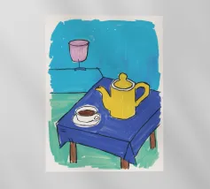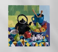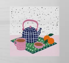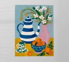Una natura morta calma e composta di una teiera verde e blu e di una tazza rosa appoggiate su un panno a righe bianche e blu. I limoni a fette aggiungono un tocco di freschezza a questa serena e invitante scena dell'ora del tè.