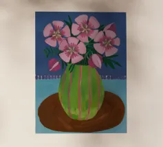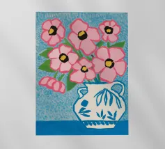 Un bouquet di fiori rosa in un vaso di terracotta poggia su una superficie a motivi rosa e neri. Lo sfondo è un blocco di turchese vibrante, che crea una composizione giocosa ed elegante che celebra il colore e il motivo.