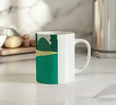 Una scena di spiaggia minimalista è rappresentata con forme geometriche decise e una tavolozza di colori limitata. Una barca a vela è parzialmente visibile dietro una duna di sabbia, mentre il mare tranquillo è affiancato da un fogliame scuro e semplificato.