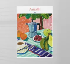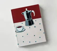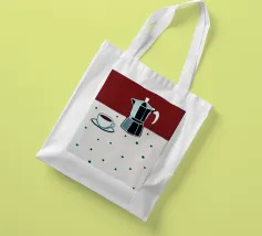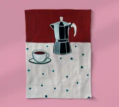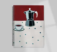 Un dipinto digitale splendidamente stilizzato con una caffettiera di vetro riempita di caffè scuro e una tazza bianca appoggiata su una tovaglia a pois. La composizione evoca un'atmosfera calma e accogliente, con uno sfondo marrone caldo che contrasta con gli elementi a punti blu.