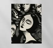 Estetica ipnotica della xilografia! Questa composizione drammatica mostra un volto femminile centrale circondato da spettatori anonimi. La magistrale tecnica del tratteggio e i radicali contrasti in bianco e nero ricordano le stampe espressioniste di M.C. Escher e Frans Masereel. Le molteplici prospettive e le diverse angolazioni creano una tensione inquietante: chi sta guardando chi? Le linee fluide e le volute ornamentali conferiscono all'opera un'eleganza Art Nouveau. Una potente meditazione sull'identità, l'anonimato e lo sguardo onnipresente degli altri.