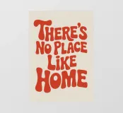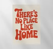 La scritta "There's No Place Like Home" appare in grandi lettere rosse su uno sfondo beige chiaro. La tipografia giocosa e leggermente irregolare conferisce al design calore e carattere.