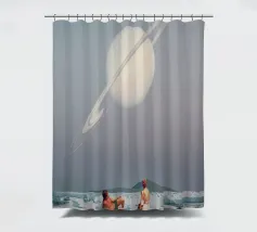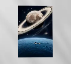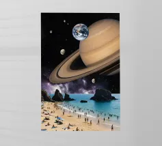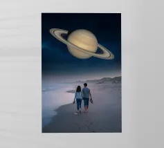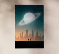 aspettando di intravedere un nuovo inizio sotto forma di una goccia di pioggia autunnale o di un raggio di sole più caldo. Quelle erano le nostre vite migliori. ~ Una coppia su un paesaggio surreale dalla superficie ghiacciata con un pianeta simile a Saturno in una composizione retrofuturistica a colori pastello