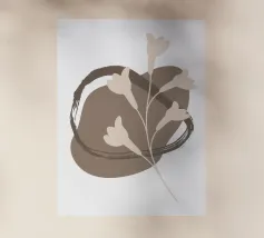 Un semplice disegno a linee marroni rappresenta una pianta con tre rami e piccole forme che ricordano foglie o boccioli. Lo stile minimalista e i colori neutri conferiscono un'atmosfera astratta.