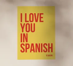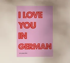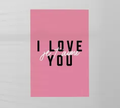 L'immagine mostra la frase "I LOVE YOU. IN FRANCESE" in caratteri grandi e decisi di colore lilla su uno sfondo beige chiaro. Sotto, le parole "Je t'aime" in un elegante carattere corsivo rosso più piccolo. La combinazione di testo in grassetto e corsivo crea un contrasto visivamente accattivante.