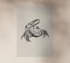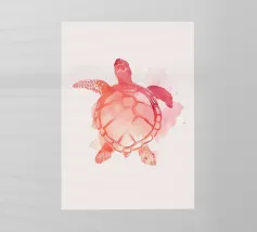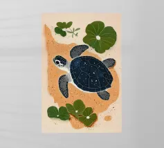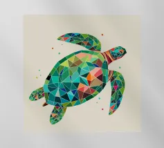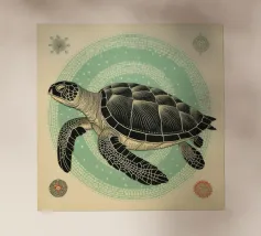 Una dettagliata illustrazione in bianco e nero di una tartaruga con un intricato disegno a linee, su un morbido sfondo beige. Un timbro rosso con la parola "Turtle" aggiunge un raffinato tocco artistico.