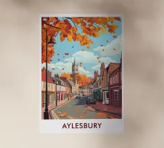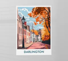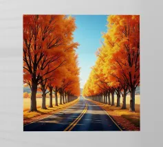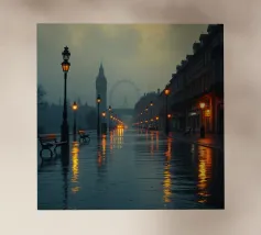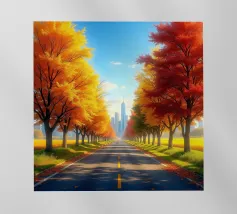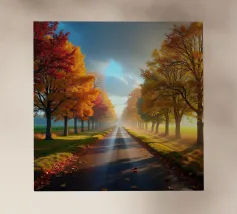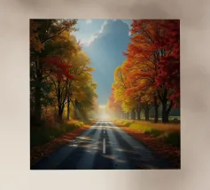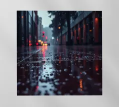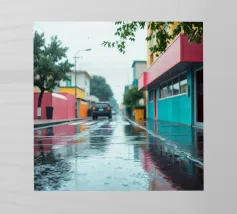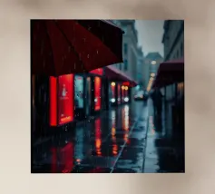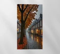 Una tranquilla strada di ciottoli riflette i vivaci colori autunnali mentre le gocce di pioggia cadono sul selciato. Gli edifici fiancheggiano la strada, esaltando l'atmosfera serena.