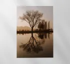 The water below mirrors the tree perfectly, capturing every leaf and curve in a soft, shimmering reflection. The surface is calm, like glass, blurring the line between reality and its mirrored twin. As light shifts gently across the scene, the reflection seems to move with it — a quiet dance of nature and water, beauty and balance